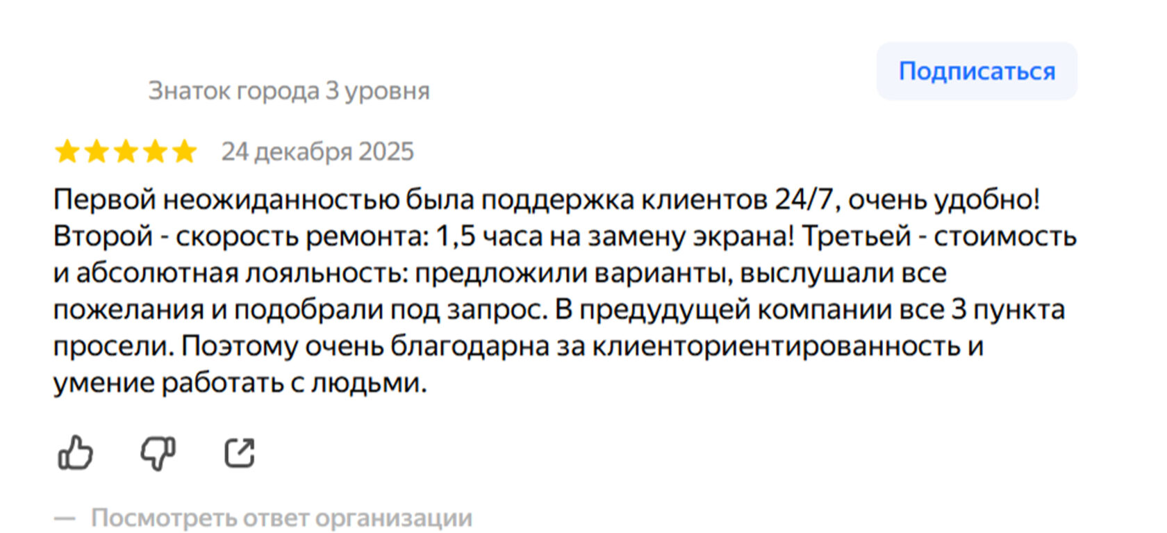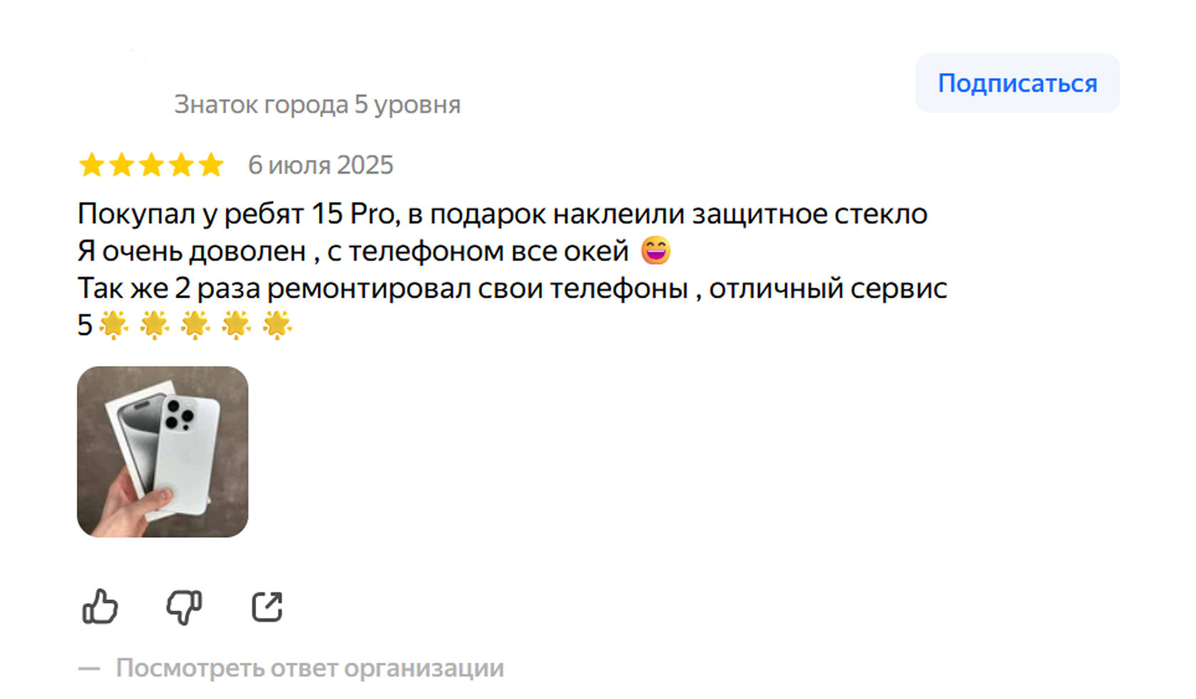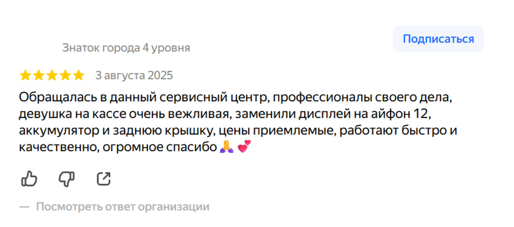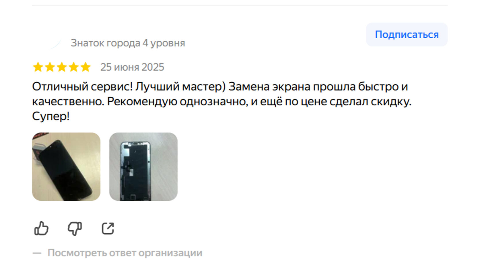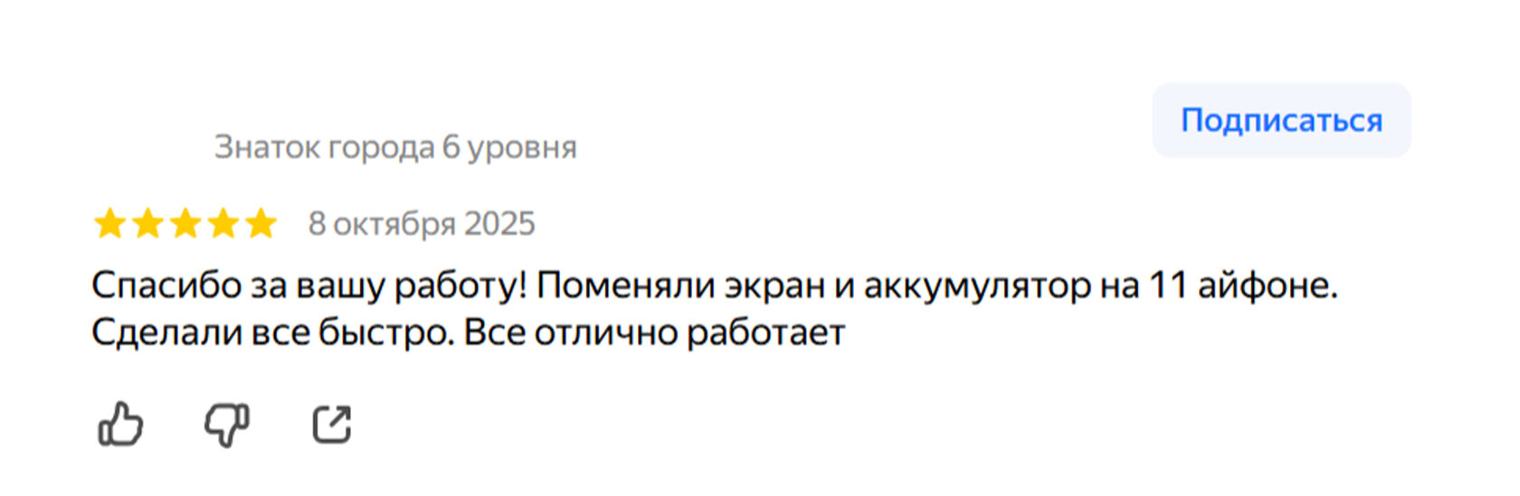Человек ищет «ремонт iPhone 11» или «замена батареи» — и видит отзыв, где это прямо написано.