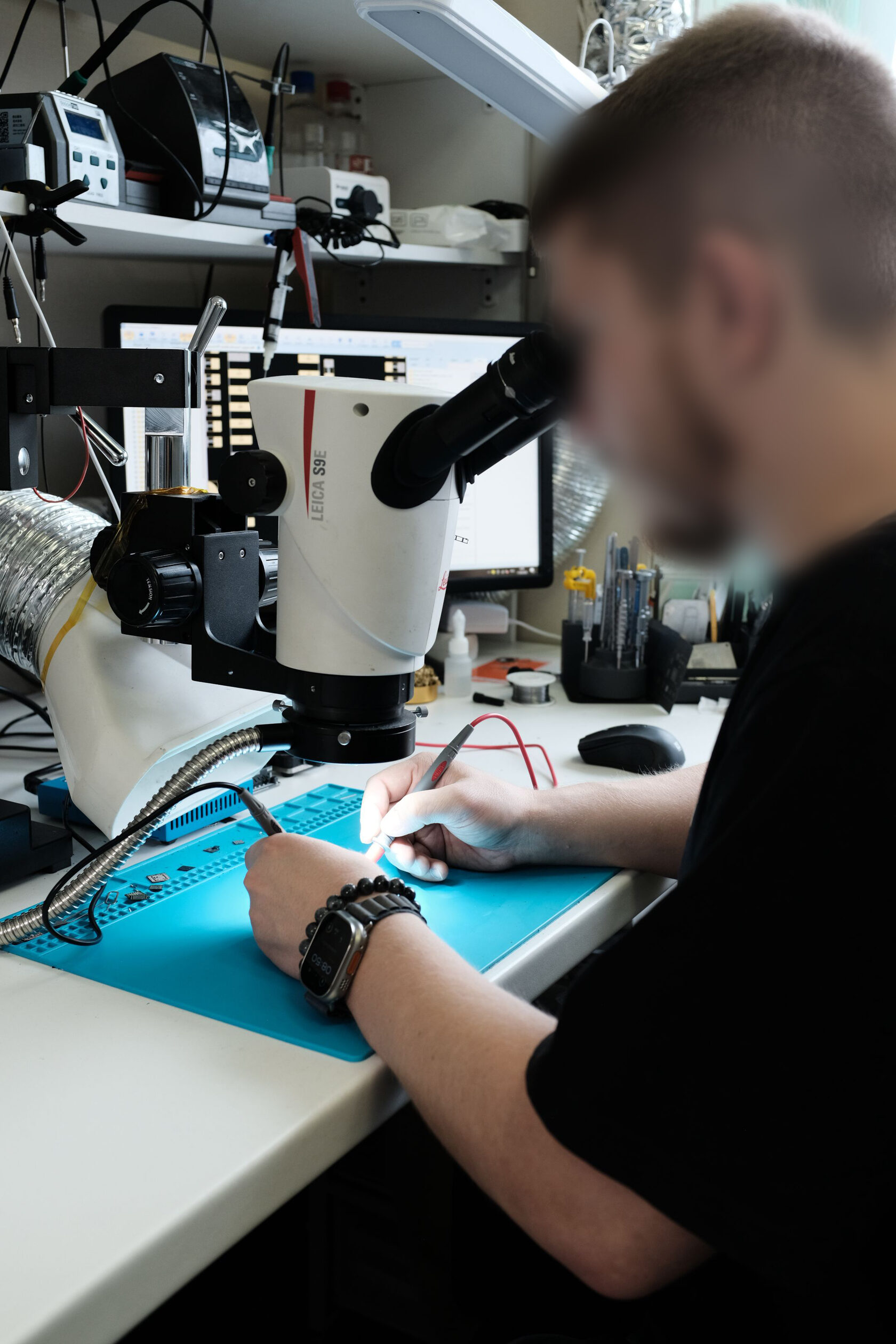 - Микроскоп, ультразвуковая ванна, паяльная станция и другие инструменты (крупный план).