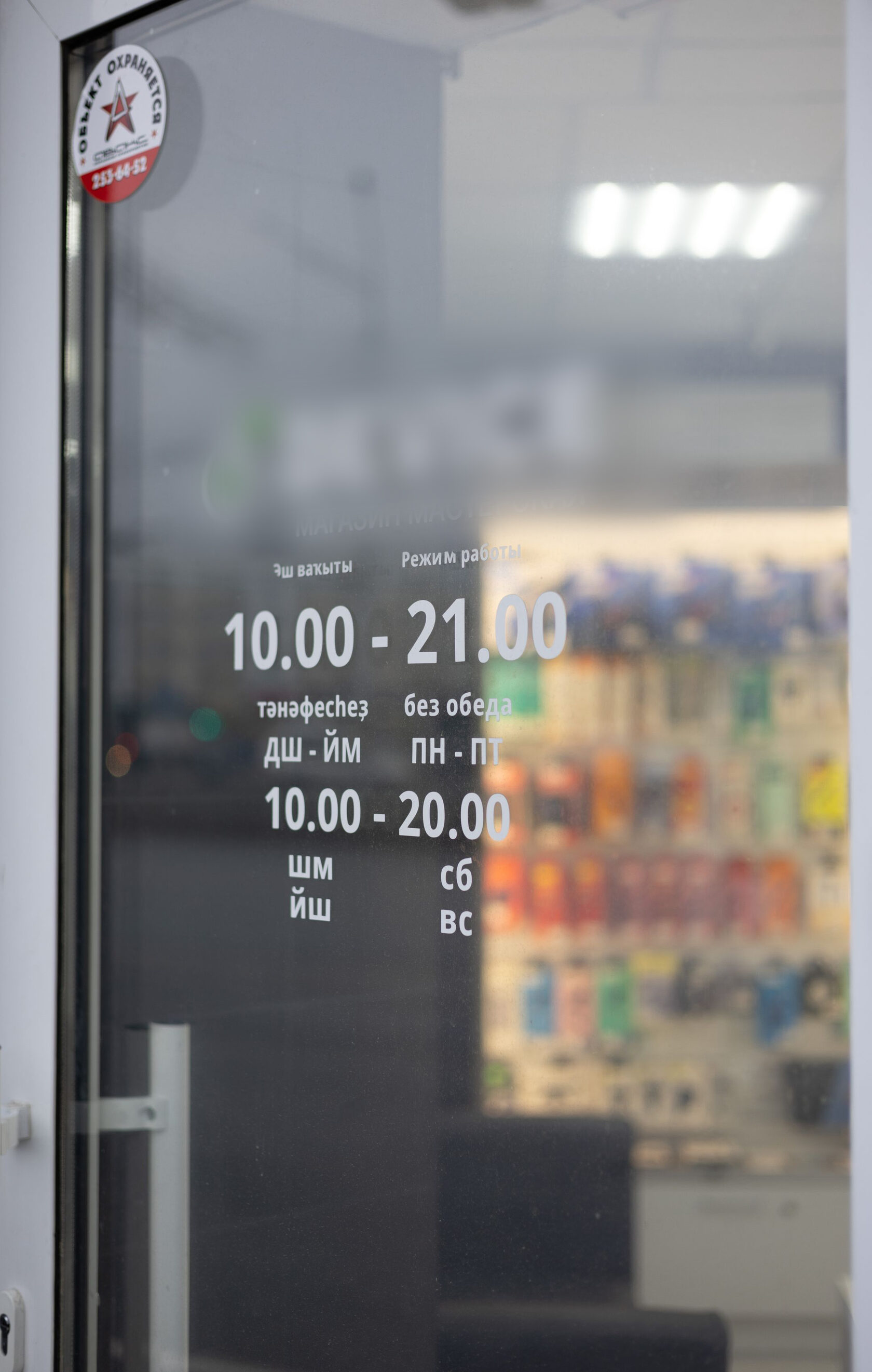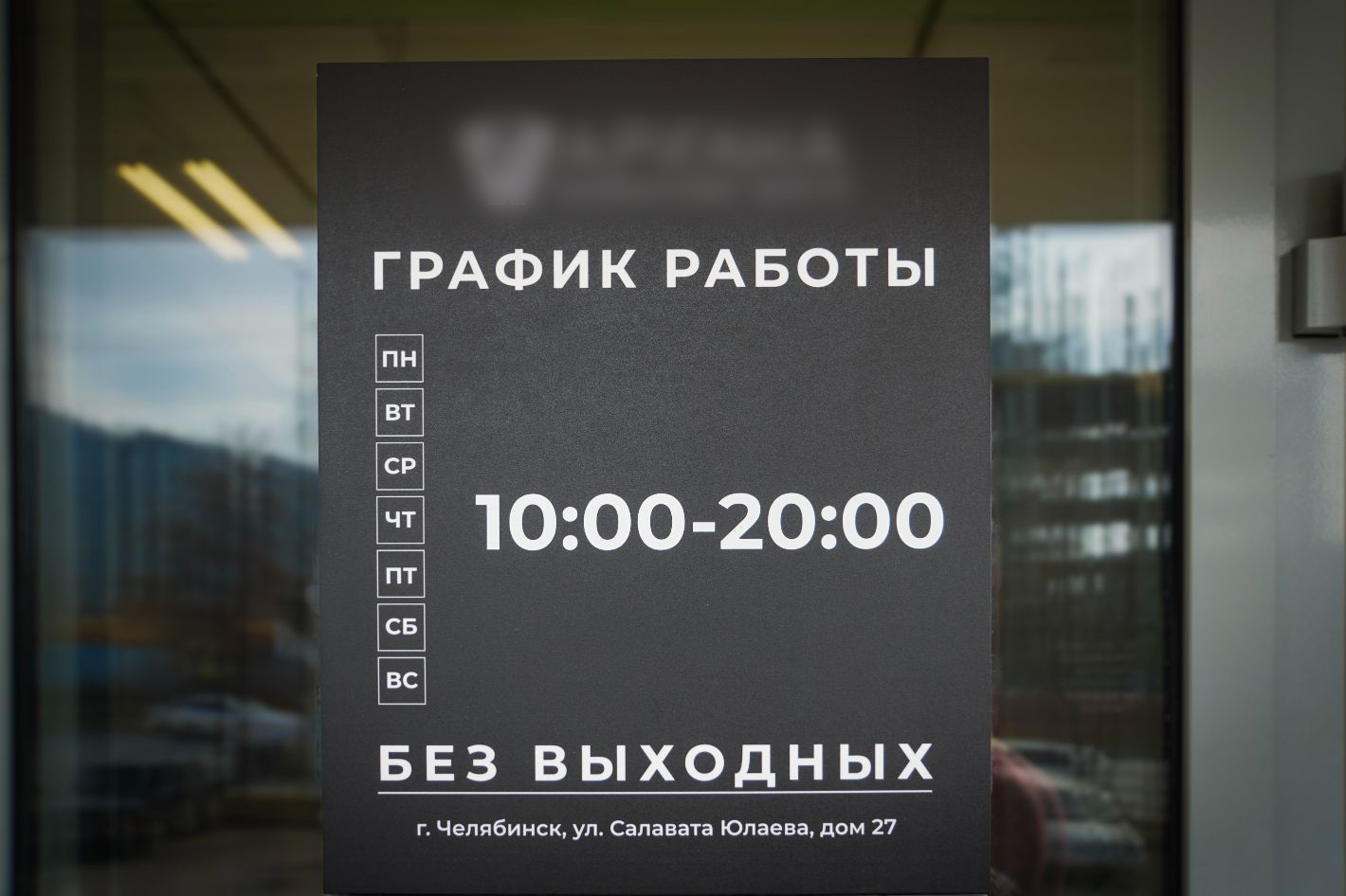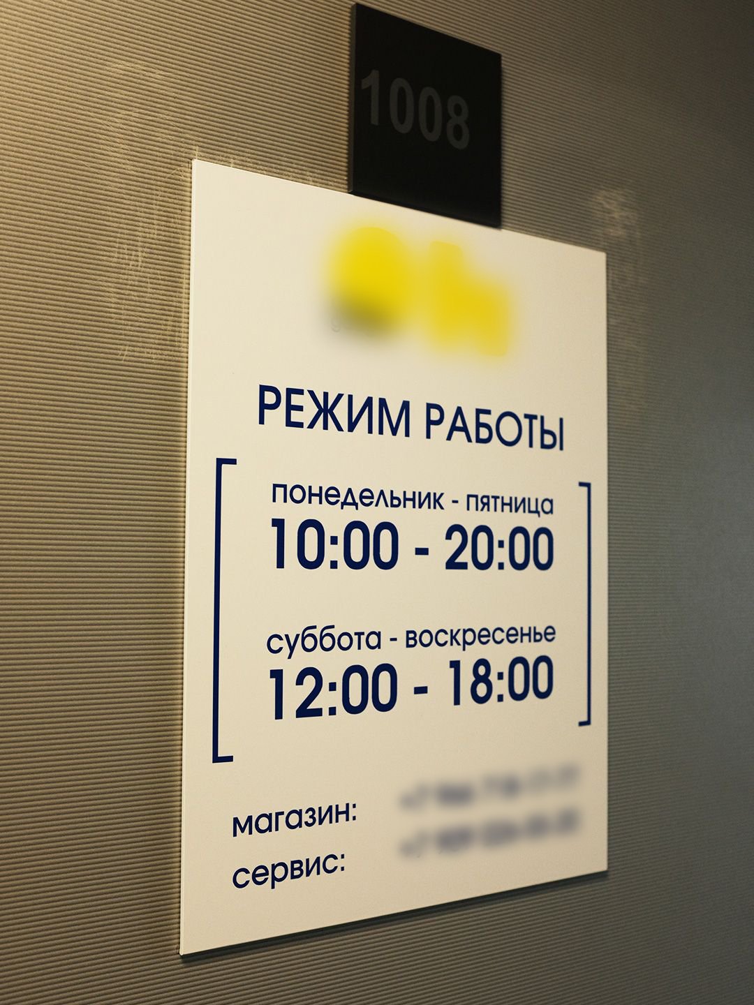 - Табличка с режимом работы на двери (крупный план).