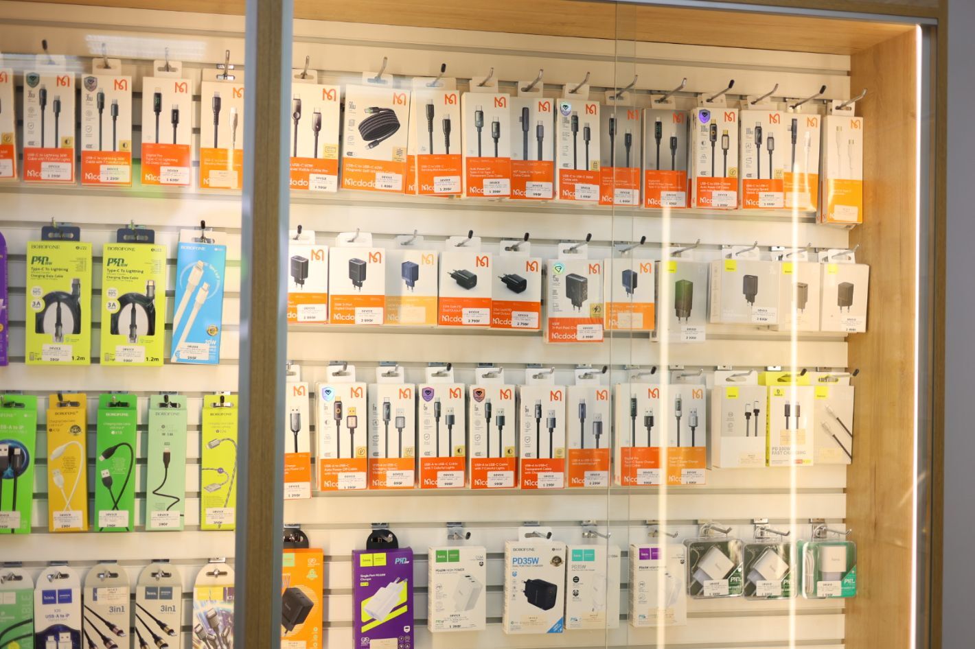 - Аксессуары: общий стенд + крупно чехлы, кабели, зарядные устройства, power bank.