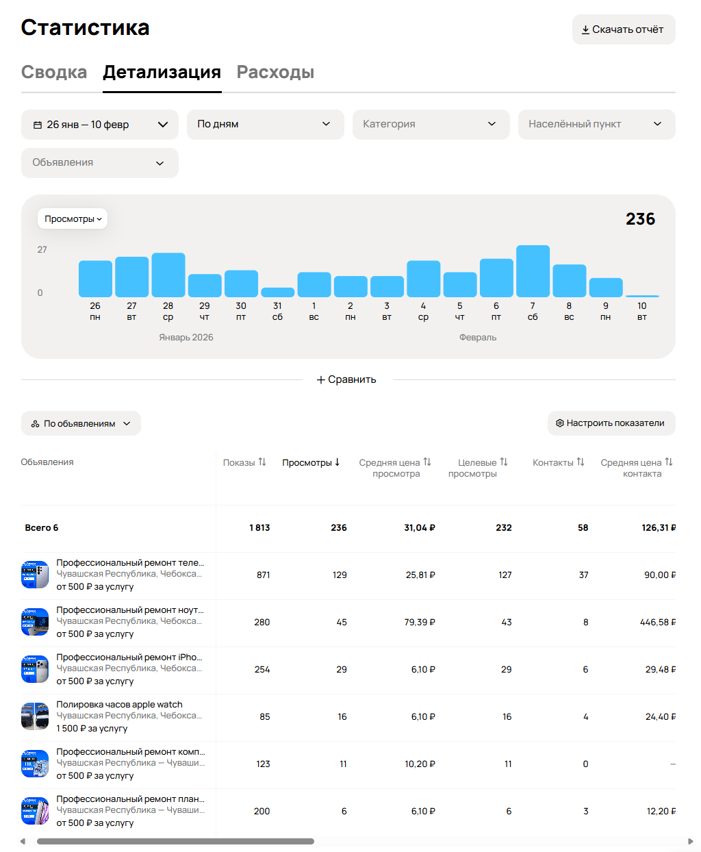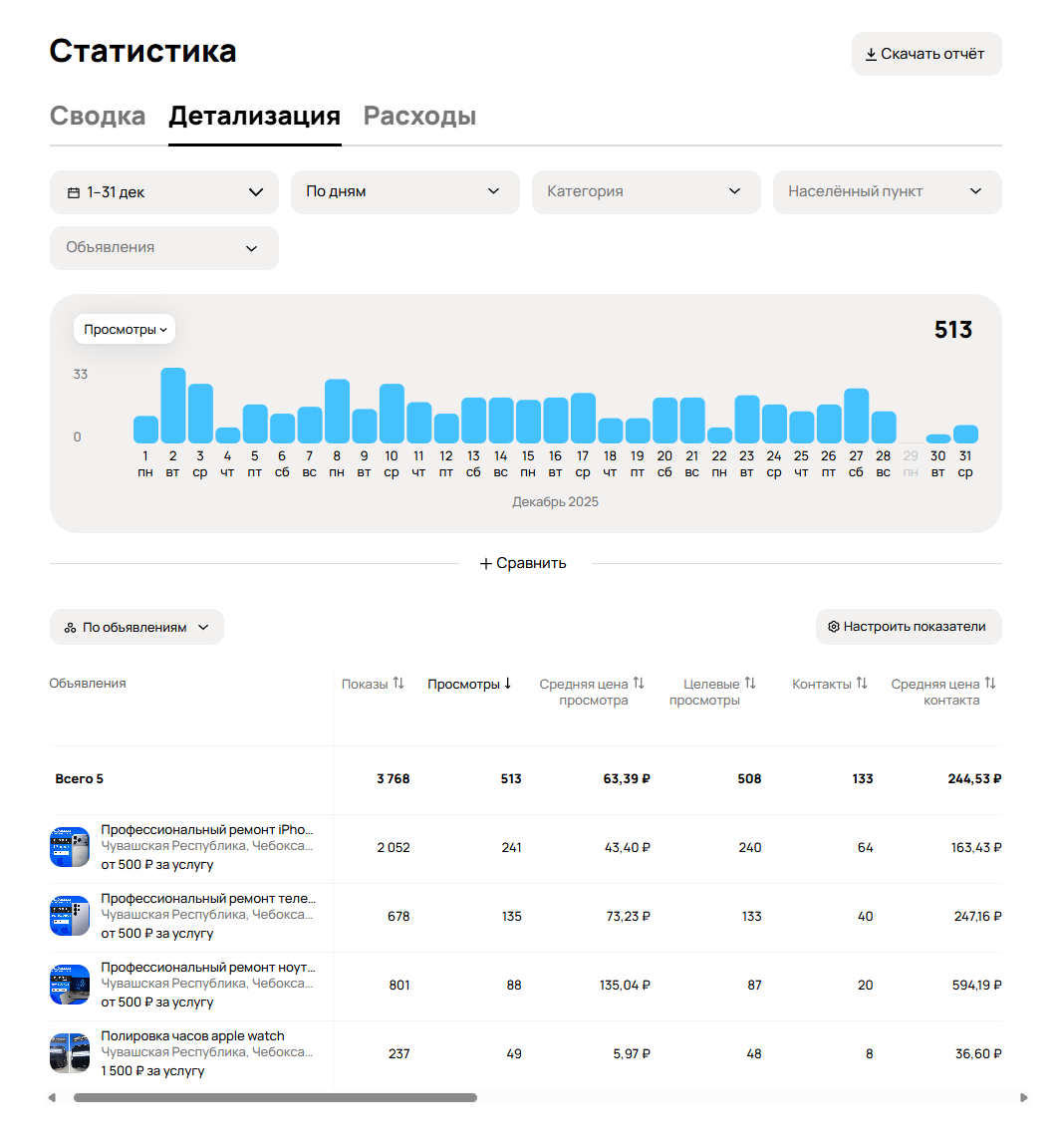 После обновления объявлений удалось получить более дешёвые заявки на ремонт телефонов и ноутбуков.
