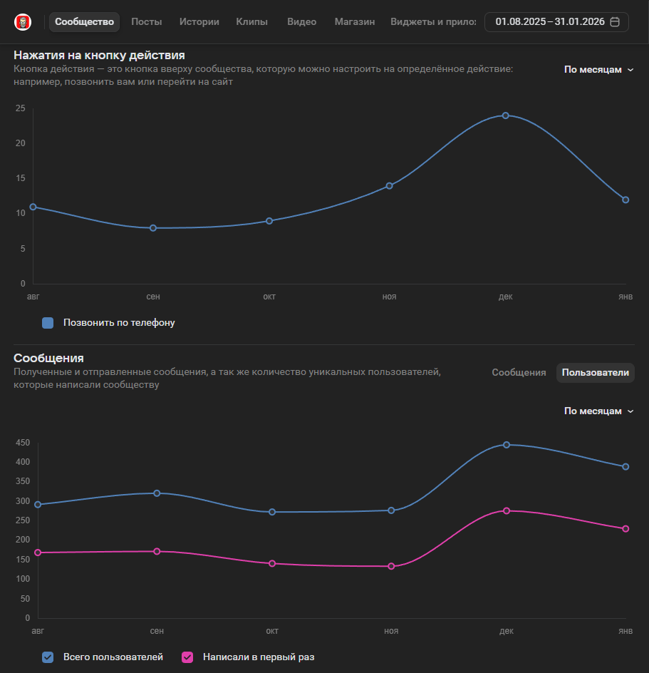 - Проект давал стабильный поток сообщений в диапазоне 130–180 обращений в месяц при умеренном бюджете.